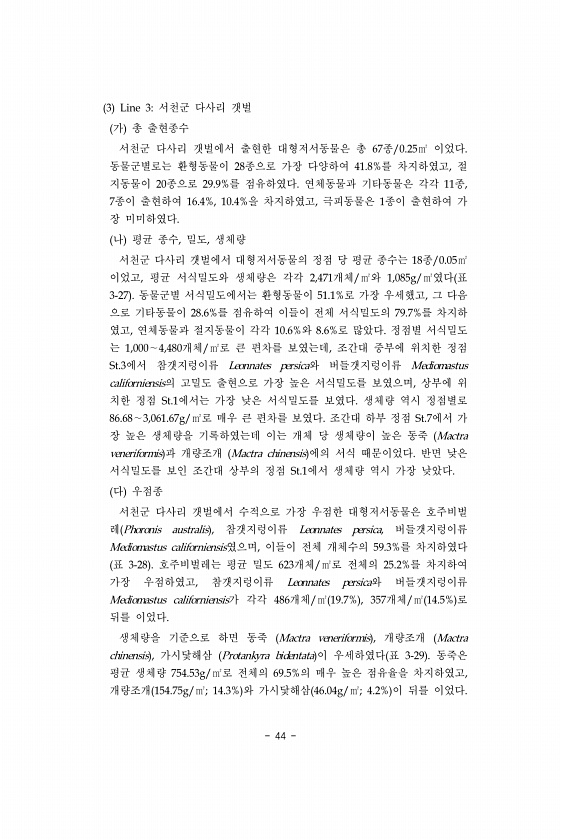 44 3 Line 3서천군 다사리 갯벌 가 총 출현종수 서천군 다사리 갯벌에서 출현한 대형저서동물은 총 67종/0.25㎡ 이었다. 동물군별로는 환형동물이 28종으로 가장 다양하여 41.8%를 차지하였고, 절 지동물이 20종으로 29.9%를 점유하였다. 연체동물과 기타동물은 각각 11종, 7종이 출현하여 16.4%, 10.4%을 차지하였고, 극피동물은 1종이 출현하여 가 장 미미하였다. 나 평균 종수, 밀도, 생체량 서천군 다사리 갯벌에서 대형저서동물의 정점 당 평균 종수는 18종/0.05㎡ 이었고, 평균 서식밀도와 생체량은 각각 2,471개체/㎡와 1,085g/㎡였다 표 3-27 동물군별 서식밀도에서는 환형동물이 51.1%로 가장 우세했고, 그 다음 으로 기타동물이 28.6%를 점유하여 이들이 전체 서식밀도...