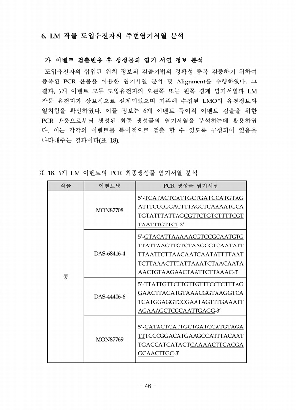 작물 이벤트명 PCR 생성물 염기서열 콩 MON87708 5-TCATACTCATTGCTGATCCATGTAG ATTTCCCGGACTTTAGCTCAAAATGCA TGTATTTATTAGCGTTCTGTCTTTTCGT TAATTTGTTCT-3DAS-68416-4 5-GTACATTAAAAACGTCCGCAATGTG TTATTAAGTTGTCTAAGCGTCAATATT TTAATTCTTAACAATCAATATTTTAAT TCTTAAACTTTATTAAATCTAACAATA AACTGTAAGAACTAATTCTTAAAC-3DAS-44406-6 5-TTATTGTTCTTGTTGTTTCCTCTTTAG GAACTTACATGTAAACGGTAAGGTCA TCATGGAGGTCCGAATAGTTTGAAATT AGAAAGCTCGCAATTGAGG-3MO...