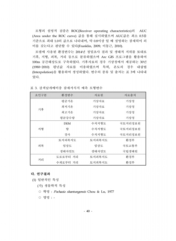 40 모형의 설명적 검증은 ROC Receiver operating characteristics 의 AUC Area under the ROC curve 값을 통해 실시하였으며 AUC값은 최소 0.5를 기준으로 최대 1.0의 값으로 나타내며, 약 0.8이상 일 때 설명하는 잠재력이 의 미를 갖는다고 판단할 수 있다 Franklin, 2009; 이동근, 2010 모델에 사용된 환경변수는 2014년 정밀조사 결과 및 생태적 지위를 토대로 기후, 지형, 피복, 거리 등으로 분류하였으며 Arc GIS 프로그램을 활용하여 100m 공간해상도로 구축하였다. 기후자료의 경우 기상청에서 제공하는 30년 19802010 평년값 자료를 이용하였으며 특히, 온도의 경우 내삽법 Interpolation 을 활용하여 생성하였다. 변...