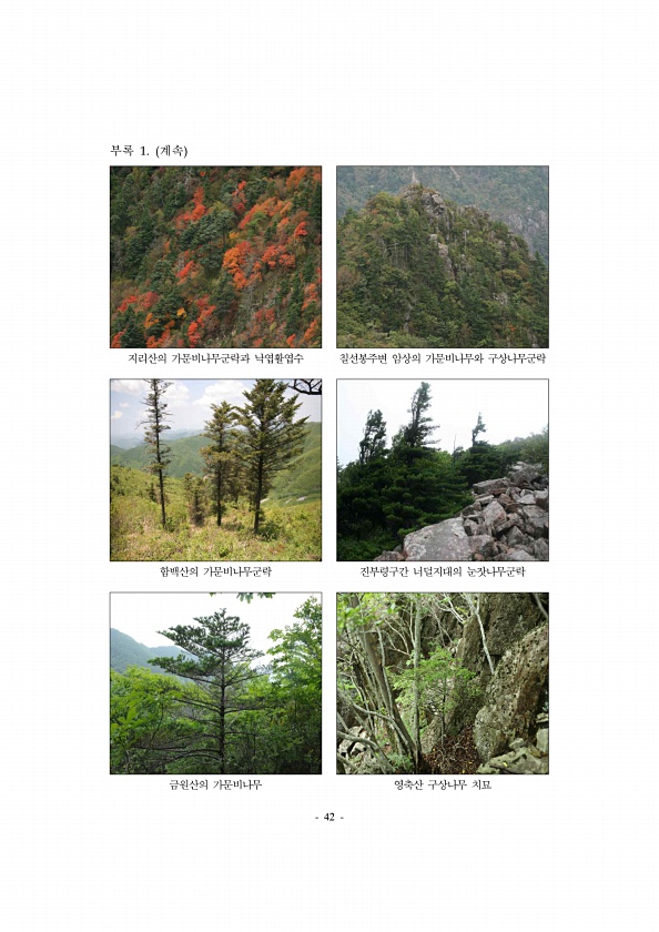 42 지리산의 가문비나무군락과 낙엽활엽수 칠선봉주변 암상의 가문비나무와 구상나무군락 함백산의 가문비나무군락 진부령구간 너덜지대의 눈잣나무군락 금원산의 가문비나무 영축산 구상나무 치묘 부록 1. 계속