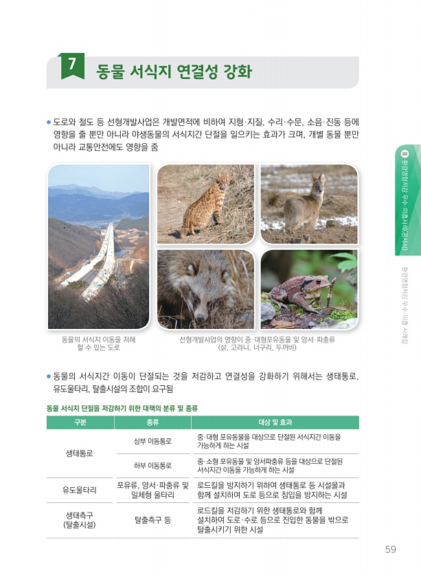 59 환경영향저감 우수·미흡사례 공사시 환경영향저감 우수·미흡 사례집 ● 도로와 철도 등 선형개발사업은 개발면적에 비하여 지형·지질, 수리·수문, 소음·진동 등에 영향을 줄 뿐만 아니라 야생동물의 서식지간 단절을 일으키는 효과가 크며, 개별 동물 뿐만 아니라 교통안전에도 영향을 줌 ● 동물의 서식지간 이동이 단절되는 것을 저감하고 연결성을 강화하기 위해서는 생태통로, 유도울타리, 탈출시설의 조합이 요구됨 동물의 서식지 이동을 저해 할 수 있는 도로 선형개발사업의 영향이 중·대형포유동물 및 양서·파충류 삵, 고라니, 너구리, 두꺼비 구분 종류 대상 및 효과 생태통로 상부 이동통로 중·대형 포유동물을 대상으로 단절된 서식지간 이동을 가능하게 하는 시설 하부 이동통로 중·소형 포유동물 및 양서파충류 등을 대상으로...