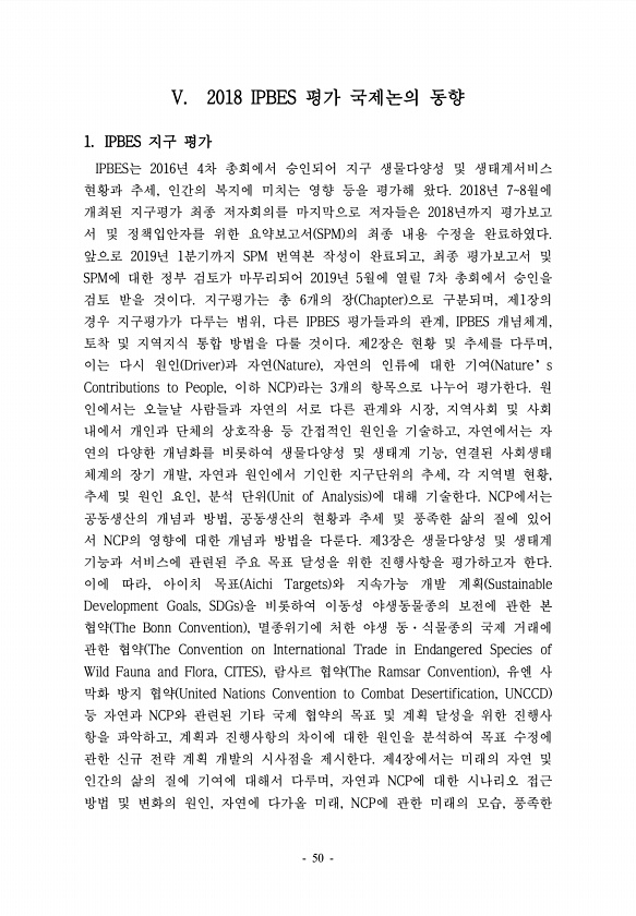 V. 2018 IPBES 평가 국제논의 동향 1. IPBES 지구 평가 IPBES는 2016년 4차 총회에서 승인되어 지구 생물다양성 및 생태계서비스 현황과 추세, 인간의 복지에 미치는 영향 등을 평가해 왔다. 2018년 78월에 개최된 지구평가 최종 저자회의를 마지막으로 저자들은 2018년까지 평가보고 서 및 정책입안자를 위한 요약보고서 SPM 의 최종 내용 수정을 완료하였다. 앞으로 2019년 1분기까지 SPM 번역본 작성이 완료되고, 최종 평가보고서 및 SPM에 대한 정부 검토가 마무리되어 2019년 5월에 열릴 7차 총회에서 승인을 검토 받을 것이다. 지구평가는 총 6개의 장 Chapter 으로 구분되며, 제1장의 경우 지구평가가 다루는 범위, 다른 IPBES 평가들과의 관계, IPBES 개념체계, ...