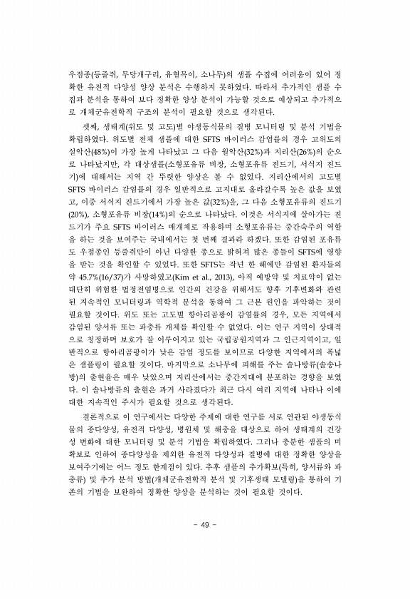 49 우점종 등줄쥐, 무당개구리, 유혈목이, 소나무 의 샘플 수집에 어려움이 있어 정 확한 유전적 다양성 양상 분석은 수행하지 못하였다. 따라서 추가적인 샘플 수 집과 분석을 통하여 보다 정확한 양상 분석이 가능할 것으로 예상되고 추가적으 로 개체군유전학적 구조의 분석이 필요할 것으로 생각된다. 셋째, 생태계 위도 및 고도 별 야생동식물의 질병 모니터링 및 분석 기법을 확립하였다. 위도별 전체 샘플에 대한 SFTS 바이러스 감염률의 경우 고위도의 설악산 48% 이 가장 높게 나타났고 그 다음 월악산 32% 과 지리산 26% 의 순으 로 나타났지만, 각 대상샘플 소형포유류 비장, 소형포유류 진드기, 서식지 진드 기 에 대해서는 지역 간 뚜렷한 양상은 볼 수 없었다. 지리산에서의 고도별 SFTS 바이러스 감염률...