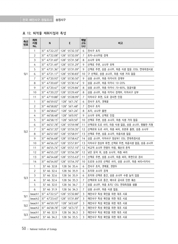 전국 해안사구 정밀조사 송정사구 50 ? National Institute of Ecology 측선 번호 채취 지점 No. N E 해발 고도 m 비고 SJ1 1 37°4722.23128°5532.336 전사구 초지 2 37°4722.08128°5532.097 초지-소나무림 경계 3 37°4721.69128°5531.588 소나무 유목 4 37°4721.49128°5531.299 산책로 주변, 소나무 유목 5 37°4721.36128°5531.099 산책로 주변, 상층 소나무, 하층 식생 없음 /OSL 연대측정시료 6 37°4721.17128°5530.8310 구 산책로, 상층 소나무, 하층 식생 거의 없음 7 37°4720.93128°5530.509 상층 소나무, 하층 아카시의 경계부 8 37°4720.69...