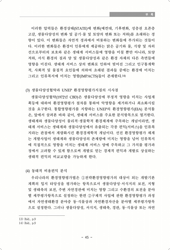 부 록 45 이러한 압력들은 환경상태 STATE 에 변화 예컨대, 기후변화, 성층권 오존층 고갈, 생물다양성의 변화 및 공기·물 및 토양의 변화 또는 저하 를 초래하는 경 향이 있다. 이 변화들은 자연적 경과에서 비롯하는 변화들에 부가되는 것들이 다. 이러한 변화들은 환경이 인류에게 제공하는 맑은 공기와 물, 식량 및 자외 선으로부터의 보호와 같은 생태계 서비스들에 영향을 미칠 뿐만 아니라, 토양 저하, 서식 환경의 질과 양 및 생물다양성과 같은 환경 자체의 다른 측면들에 영향을 미친다. 생태계 서비스 상의 변화로 인하여 빚어진 그리고 인구통계학 적, 사회적 및 물질적 요인들에 의하여 초래된 결과들 중에는 환경에 미치는 그리고 인류복지에 미치는 영향 IMPACTS 들이 존재한다.14 3 생물다양성협약과 UN...