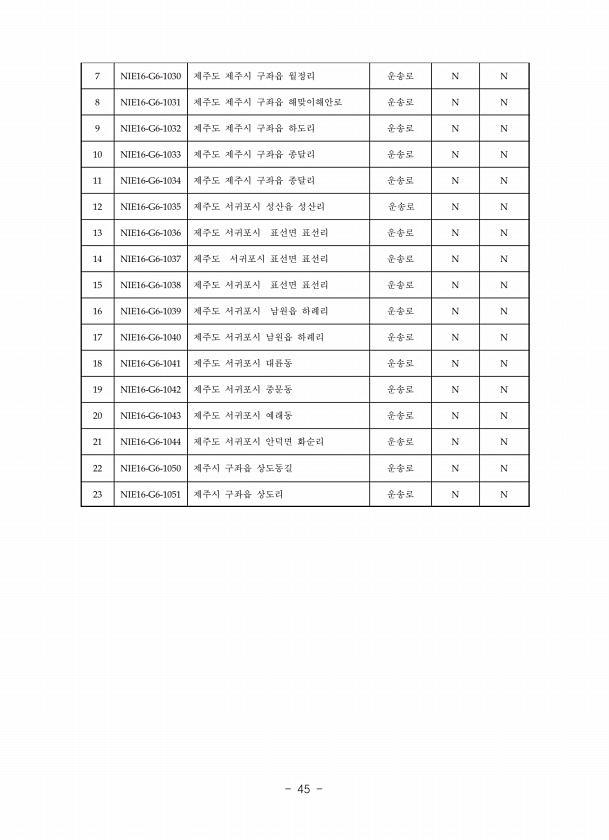 7 NIE16-G6-1030 제주도 제주시 구좌읍 월정리 운송로 N N 8 NIE16-G6-1031 제주도 제주시 구좌읍 해맞이해안로 운송로 N N 9 NIE16-G6-1032 제주도 제주시 구좌읍 하도리 운송로 N N 10 NIE16-G6-1033 제주도 제주시 구좌읍 종달리 운송로 N N 11 NIE16-G6-1034 제주도 제주시 구좌읍 종달리 운송로 N N 12 NIE16-G6-1035 제주도 서귀포시 성산읍 성산리 운송로 N N 13 NIE16-G6-1036 제주도 서귀포시 표선면 표선리 운송로 N N 14 NIE16-G6-1037 제주도 서귀포시 표선면 표선리 운송로 N N 15 NIE16-G6-1038 제주도 서귀포시 표선면 표선리 운송로 N N 16 NIE16-G6-1039 제주도 서귀포시 남...
