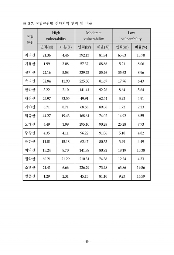 49 국립 공원 High vulnerability Moderate vulnerability Low vulnerability 면적 ㎢ 비율 % 면적 ㎢ 비율 % 면적 ㎢ 비율 % 지리산 21.36 4.46 392.13 81.84 65.63 13.70 계룡산 1.99 3.08 57.37 88.86 5.21 8.06 설악산 22.16 5.58 339.75 85.46 35.63 8.96 속리산 32.84 11.90 225.50 81.67 17.76 6.43 한라산 3.22 2.10 141.41 92.26 8.64 5.64 내장산 25.97 32.55 49.91 62.54 3.92 4.91 가야산 6.71 8.71 68.58 89.06 1.72 2.23 덕유산 44.27 19.43 168.61 74.02 14.92 ...