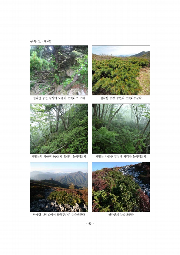 43 설악산 능선 암상에 노출된 눈잣나무 근계 설악산 중청 주변의 눈잣나무군락 계방산의 가문비나무군락 임내의 눈측백군락 계방산 사면부 암상에 자리한 눈측백군락 한계령 갈림길에서 끝청구간의 눈측백군락 설악산의 눈측백군락 부록 1. 계속