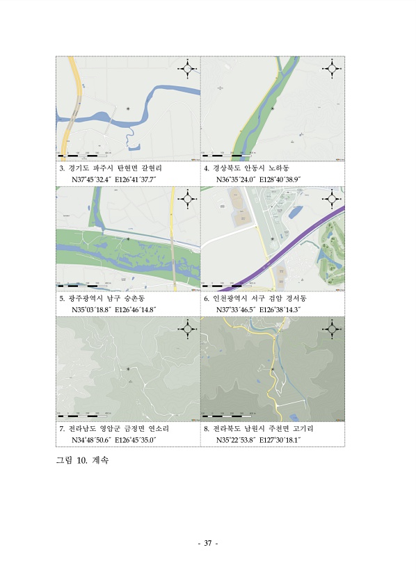 37 3. 경기도 파주시 탄현면 갈현리 N37˚45´32.4˝ E126˚41´37.7˝ 4. 경상북도 안동시 노하동 N36˚35´24.0˝ E128˚40´38.9˝ 5. 광주광역시 남구 승촌동 N35˚03´18.8˝ E126˚46´14.8˝ 6. 인천광역시 서구 검암 경서동 N37˚33´46.5˝ E126˚38´14.3˝ 7. 전라남도 영암군 금정면 연소리 N34˚48´50.6˝ E126˚45´35.0˝ 8. 전라북도 남원시 주천면 고기리 N35˚22´53.8˝ E127˚30´18.1˝ 그림 10.계속