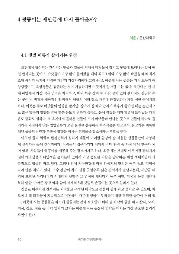 60 국가장기생태연구 4 짱뚱어는 새만금에 다시 돌아올까? 최윤 군산대학교 4.1 갯벌 어류가 살아가는 환경 조간대에 형성되는 간석지는 민물과 썰물에 의해서 바닷물에 잠기고 햇볕에 드러나는 일이 매 일 반복되는 곳이며, 바닷물이 가장 많이 들어왔을 때의 최고조위와 가장 많이 빠졌을 때의 최저 조위 사이의 육지에 인접한 해양의 가장자리이다 그림 4-1 이곳에 사는 생물은 거의 모두가 해 양생물이고, 육상생물은 접근하는 것이 가능하지만 이곳에서 살아갈 수는 없다. 조간대는 전 세 계 해양에서 가장 적은 면적을 차지하고, 배와 특수 장비 등 비싼 장비 없이 걸어서도 접근할 수 는 곳이며, 범위가 제한적인데 비해서 해양의 여러 장소 가운데 환경변화가 가장 심한 곳이기도 하다. 이곳은 주로 바닷물의 영향을 받지만, ...