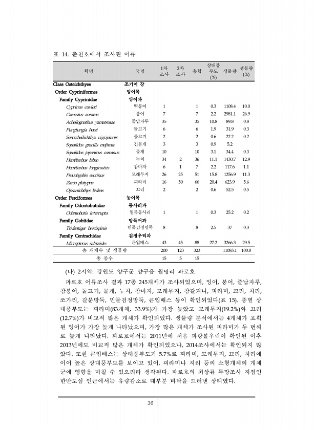 36 학명 국명 1차 조사 2차 조사 총합 상대풍 부도 % 생물량 생물량 % Class Osteichthyes 조기어 강 Order Cypriniformes 잉어목 Family Cyprinidae 잉어과 Cyprinus cuvieri 떡붕어 1 1 0.3 1108.4 10.0 Carassius auratus 붕어 7 7 2.2 2981.1 26.9 Acheilognathus yamatsutae 줄납자루 35 35 10.8 89.8 0.8 Pungtungia herzi 돌고기 6 6 1.9 31.9 0.3 Sarcocheilichthys nigripinnis 중고기 2 2 0.6 22.2 0.2 Squalidus gracilis majimae 긴몰개 3 3 0.9 5.2 Squalidus japonicus c...