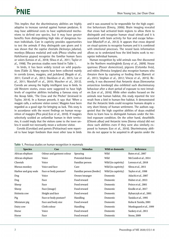 Won Young Lee, Jae Chun Choe 2 Proceedings of NIE 2020;1 1 1-8 This implies that the discriminatory abilities are highly adaptive to increase survival against human predators. It may have additional costs to have sophisticated mechanisms to defend one species, but it may have greater benefits from distinguishing high risks of dangerous human individuals. Care in captivity provides opportunities to...