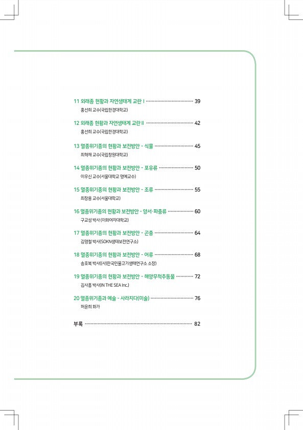 11 외래종 현황과 자연생태계 교란Ⅰ…………………………… 39 홍선희 교수 국립한경대학교 12 외래종 현황과 자연생태계 교란Ⅱ …………………………… 42 홍선희 교수 국립한경대학교 13 멸종위기종의 현황과 보전방안 식물 ……………………… 45 최혁재 교수 국립창원대학교 14 멸종위기종의 현황과 보전방안 포유류 …………………… 50 이우신 교수 서울대학교 명예교수 15 멸종위기종의 현황과 보전방안 조류 ……………………… 55 최창용 교수 서울대학교 16 멸종위기종의 현황과 보전방안 양서·파충류 ……………… 60 구교성 박사 이화여자대학교 17 멸종위기종의 현황과 보전방안 곤충 ……………………… 64 김명철 박사 SOKN생태보전연구소 18 멸종위기종의 현황과 보전방안 어류 ……………………… 68 송호복 박사 사...