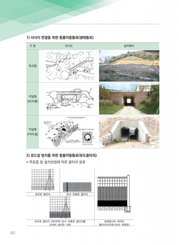 60 1 서식지 연결을 위한 동물이동통로 생태통로 구 분 모식도 설치예시 육교형 터널형 BOX형 터널형 PIPE형 2 로드킬 방지를 위한 동물이동통로 유도울타리 ● 목표종 및 설치방법에 따른 울타리분류