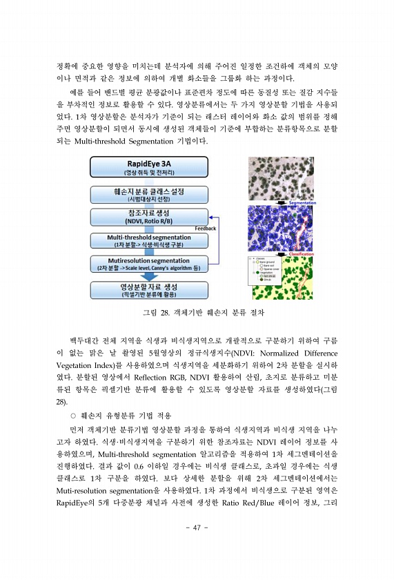 47 정확에 중요한 영향을 미치는데 분석자에 의해 주어진 일정한 조건하에 객체의 모양 이나 면적과 같은 정보에 의하여 개별 화소들을 그룹화 하는 과정이다. 예를 들어 밴드별 평균 분광값이나 표준편차 정도에 따른 동질성 또는 질감 지수들 을 부차적인 정보로 활용할 수 있다. 영상분류에서는 두 가지 영상분할 기법을 사용되 었다. 1차 영상분할은 분석자가 기준이 되는 래스터 레이어와 화소 값의 범위를 정해 주면 영상분할이 되면서 동시에 생성된 객체들이 기준에 부합하는 분류항목으로 분할 되는 Multi-threshold Segmentation 기법이다. 그림 28. 객체기반 훼손지 분류 절차 백두대간 전체 지역을 식생과 비식생지역으로 개괄적으로 구분하기 위하여 구름 이 없는 맑은 날 촬영된 5월영상의 정규식생지수 ...