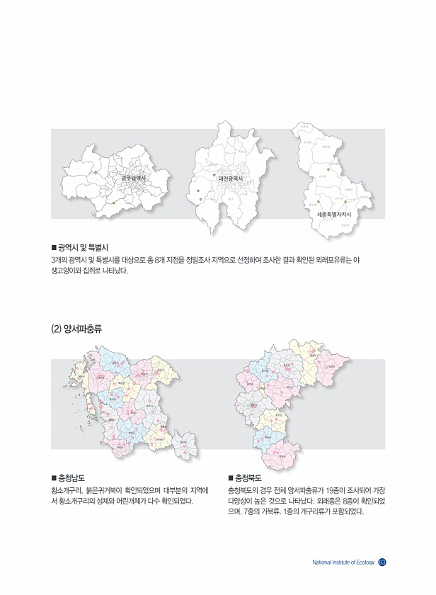 National Institute of Ecology 63 2 양서파충류 ■ 충청남도 황소개구리, 붉은귀거북이 확인되었으며 대부분의 지역에 서 황소개구리의 성체와 어린개체가 다수 확인되었다. ■ 광역시 및 특별시 3개의 광역시 및 특별시를 대상으로 총 8개 지점을 정밀조사 지역으로 선정하여 조사한 결과 확인된 외래포유류는 야 생고양이와 집쥐로 나타났다. ■ 충청북도 충청북도의 경우 전체 양서파충류가 19종이 조사되어 가장 다양성이 높은 것으로 나타났다. 외래종은 8종이 확인되었 으며, 7종의 거북류, 1종의 개구리류가포함되었다.