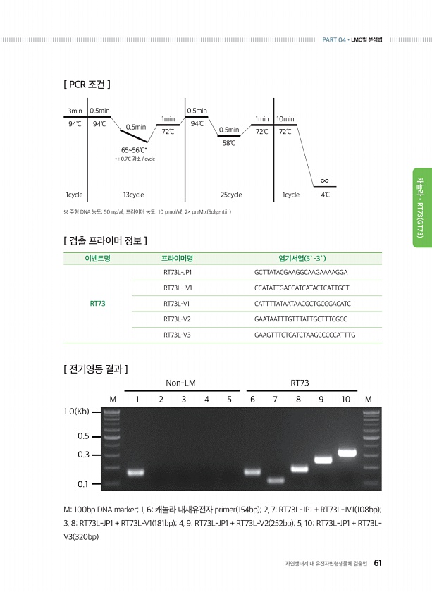 자연생태계 내 유전자변형생물체 검출법 61 PART 04?LMO별 분석법 캐놀라?RT73 GT73 [ 검출 프라이머 정보 ] 이벤트명 프라이머명 염기서열 5`-3` RT73 RT73L-JP1 GCTTATACGAAGGCAAGAAAAGGA RT73L-JV1 CCATATTGACCATCATACTCATTGCT RT73L-V1 CATTTTATAATAACGCTGCGGACATC RT73L-V2 GAATAATTTGTTTATTGCTTTCGCC RT73L-V3 GAAGTTTCTCATCTAAGCCCCCATTTG M100bp DNA marker; 1, 6캐놀라 내재유전자 primer 154bp ; 2, 7RT73L-JP1 + RT73L-JV1 108bp ; 3, 8RT73L-JP1 + RT73L-V1 181bp ; 4, 9RT73...