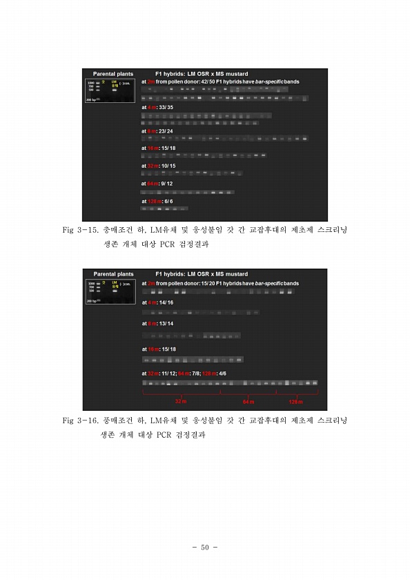 50 Fig 3-15. 충매조건 하, LM유채 및 웅성불임 갓 간 교잡후대의 제초제 스크리닝 생존 개체 대상 PCR 검정결과 Fig 3-16. 풍매조건 하, LM유채 및 웅성불임 갓 간 교잡후대의 제초제 스크리닝 생존 개체 대상 PCR검정결과