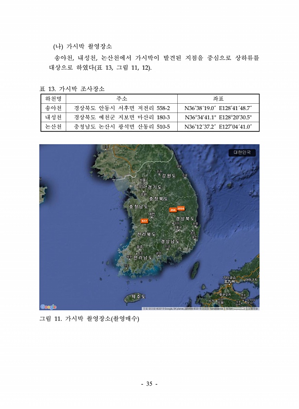 35 하천명 주소 좌표 송야천 경상북도 안동시 서후면 저전리 558-2 N36˚38´19.0˝ E128˚41´48.7˝ 내성천 경상북도 예천군 지보면 마산리 180-3 N36°3441.1E128°2030.5논산천 충청남도 논산시 광석면 산동리 510-5 N36˚12´37.2˝ E127˚04´41.0˝ 나 가시박 촬영장소 송야천, 내성천, 논산천에서 가시박이 발견된 지점을 중심으로 상하류를 대상으로 하였다 표 13, 그림 11, 12 표 13. 가시박 조사장소 그림 11. 가시박 촬영장소 촬영매수