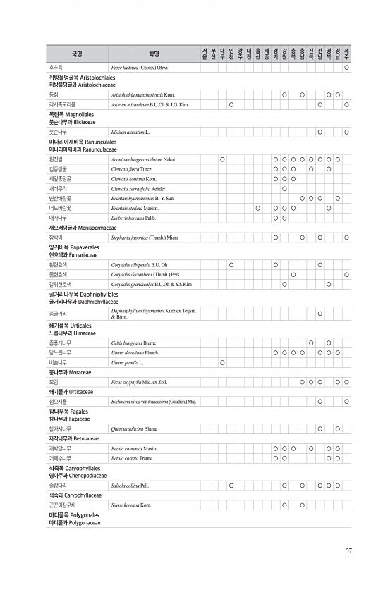 57 후추등 Piper kadsura Choisy Ohwi ○ 쥐방울덩굴목 Aristolochiales 쥐방울덩굴과 Aristolochiaceae 등칡 Aristolochia manshuriensis Kom. ○ ○ ○ ○ 각시족도리풀 Asarum misandrum B.U.Oh & J.G. Kim ○ ○ ○ 목련목 Magnoliales 붓순나무과 Illiciaceae 붓순나무 Illicium anisatum L. ○ ○ 미나리아재비목 Ranunculales 미나리아재비과 Ranunculaceae 흰진범 Aconitum longecassidatum Nakai ○ ○ ○ ○ ○ ○ ○ ○ ○ 검종덩굴 Clematis fusca Turcz. ○ ○ ○ ○ ○ 세잎종덩굴 Clematis koreana Kom. ○ ...