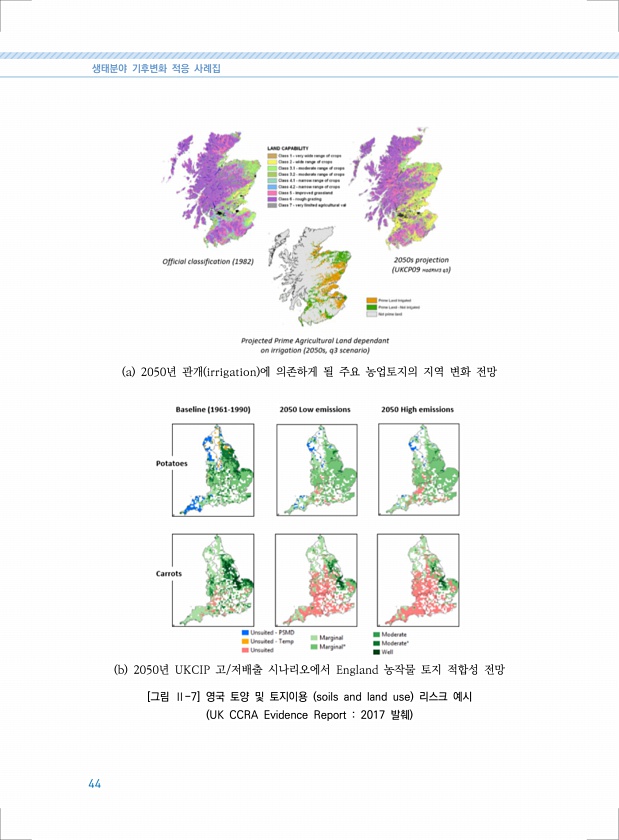 생태분야 기후변화 적응 사례집 44 a 2050년 관개 irrigation 에 의존하게 될 주요 농업토지의 지역 변화 전망 b 2050년 UKCIP 고/저배출 시나리오에서 England 농작물 토지 적합성 전망 [그림 Ⅱ-7] 영국 토양 및 토지이용 soils and land use 리스크 예시 UK CCRA Evidence Report 2017 발췌