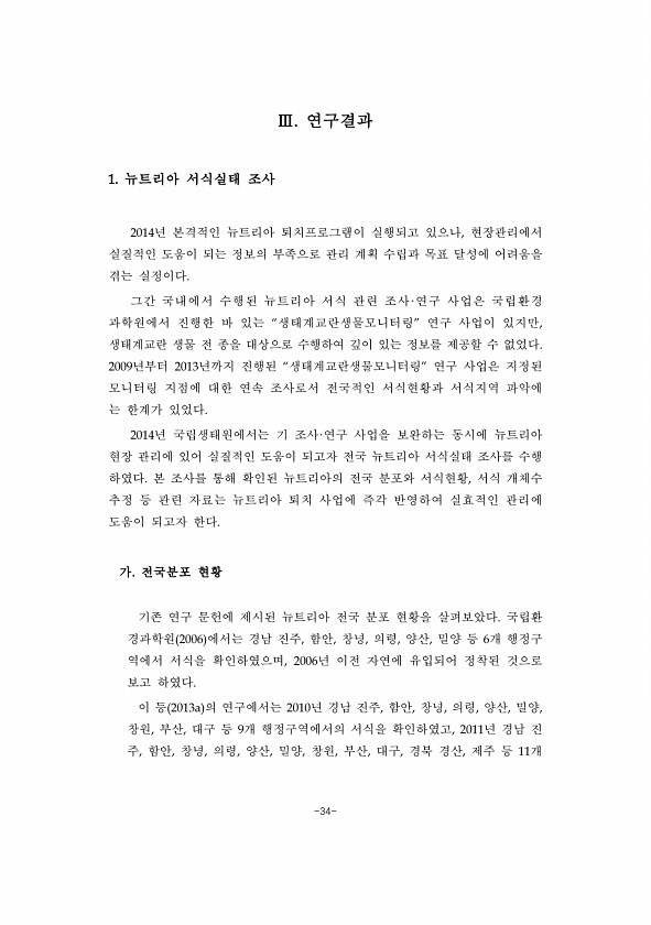 -34- Ⅲ. 연구결과 1. 뉴트리아 서식실태 조사 2014년 본격적인 뉴트리아 퇴치프로그램이 실행되고 있으나, 현장관리에서 실질적인 도움이 되는 정보의 부족으로 관리 계획 수립과 목표 달성에 어려움을 겪는 실정이다. 그간 국내에서 수행된 뉴트리아 서식 관련 조사·연구 사업은 국립환경 과학원에서 진행한 바 있는 “생태계교란생물모니터링” 연구 사업이 있지만, 생태계교란 생물 전 종을 대상으로 수행하여 깊이 있는 정보를 제공할 수 없었다. 2009년부터 2013년까지 진행된 “생태계교란생물모니터링” 연구 사업은 지정된 모니터링 지점에 대한 연속 조사로서 전국적인 서식현황과 서식지역 파악에 는 한계가 있었다. 2014년 국립생태원에서는 기 조사·연구 사업을 보완하는 동시에 뉴트리아 현장 관리에 있어 실질적인 도움...