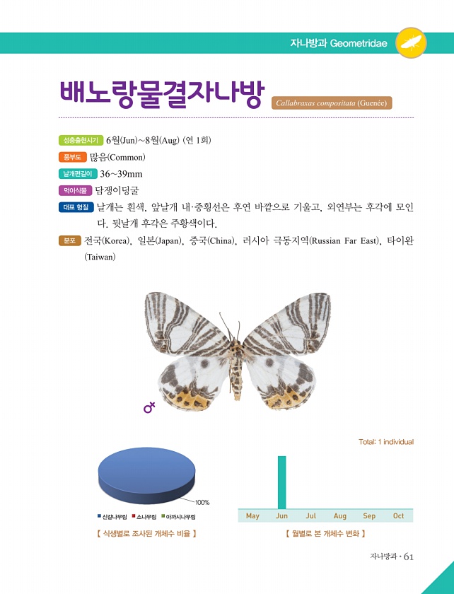 자나방과?61 자나방과 Geometridae 성충출현시기 6월 Jun 8월 Aug 연 1회 풍부도 많음 Common 날개편길이 3639mm 먹이식물 담쟁이덩굴 대표 형질 날개는 흰색, 앞날개 내·중횡선은 후연 바깥으로 기울고, 외연부는 후각에 모인 다. 뒷날개 후각은 주황색이다. 분포 전국 Korea , 일본 Japan , 중국 China , 러시아 극동지역 Russian Far East , 타이완 Taiwan 배노랑물결자나방 Callabraxas compositata Guen?e 【 식생별로 조사된 개체수 비율 】 100% 신갈나무림 소나무림 아까시나무림 【 월별로 본 개체수 변화 】 Total1 individual May Jun Jul Aug SepOct