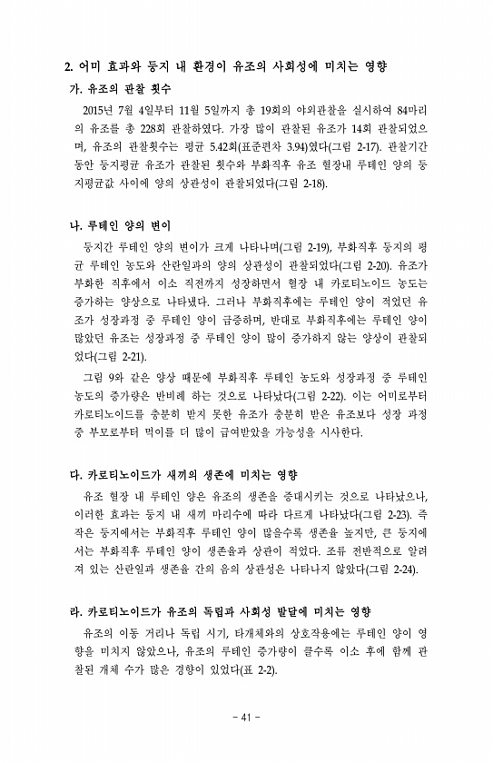 2. 어미 효과와 둥지 내 환경이 유조의 사회성에 미치는 영향 가. 유조의 관찰 횟수 2015년 7월 4일부터 11월 5일까지 총 19회의 야외관찰을 실시하여 84마리 의 유조를 총 228회 관찰하였다. 가장 많이 관찰된 유조가 14회 관찰되었으 며, 유조의 관찰횟수는 평균 5.42회 표준편차 3.94 였다 그림 2-17 관찰기간 동안 둥지평균 유조가 관찰된 횟수와 부화직후 유조 혈장내 루테인 양의 둥 지평균값 사이에 양의 상관성이 관찰되었다 그림 2-18 나. 루테인 양의 변이 둥지간 루테인 양의 변이가 크게 나타나며 그림 2-19 , 부화직후 둥지의 평 균 루테인 농도와 산란일과의 양의 상관성이 관찰되었다 그림 2-20 유조가 부화한 직후에서 이소 직전까지 성장하면서 혈장 내 카로티노이드 농도는 증가하는...