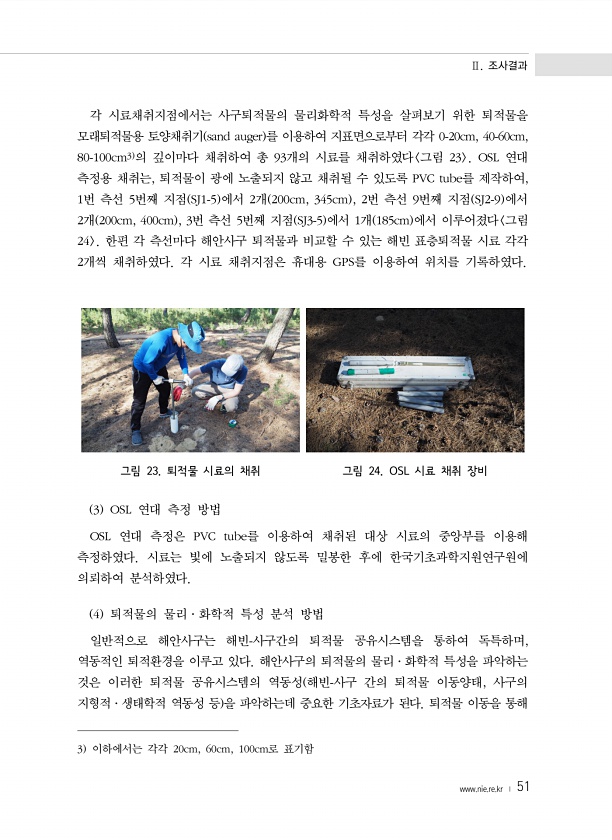 Ⅱ. 조사결과 www.nie.re.kr ? 51 각 시료채취지점에서는 사구퇴적물의 물리화학적 특성을 살펴보기 위한 퇴적물을 모래퇴적물용 토양채취기 sand auger 를 이용하여 지표면으로부터 각각 0-20cm, 40-60cm, 80-100cm3 의 깊이마다 채취하여 총 93개의 시료를 채취하였다 그림 23 OSL 연대 측정용 채취는, 퇴적물이 광에 노출되지 않고 채취될 수 있도록 PVC tube를 제작하여, 1번 측선 5번째 지점 SJ1-5 에서 2개 200cm, 345cm , 2번 측선 9번째 지점 SJ2-9 에서 2개 200cm, 400cm , 3번 측선 5번째 지점 SJ3-5 에서 1개 185cm 에서 이루어졌다 그림 24 한편 각 측선마다 해안사구 퇴적물과 비교할 수 있는 해빈 표층퇴적물 시료 각각...