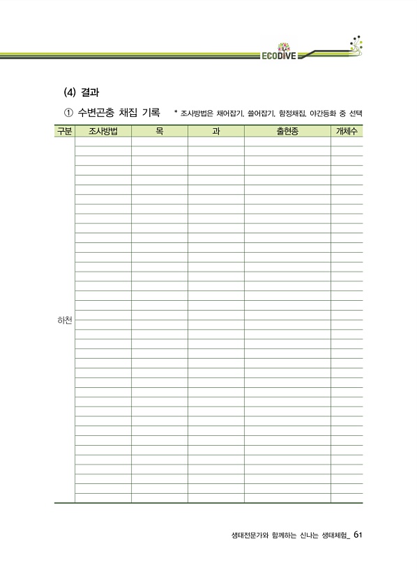 생태전문가와 함께하는 신나는 생태체험_ 61 4 결과 ① 수변곤충 채집 기록 * 조사방법은 채어잡기, 쓸어잡기, 함정채집, 야간등화 중 선택 구분 조사방법 목 과 출현종 개체수하천