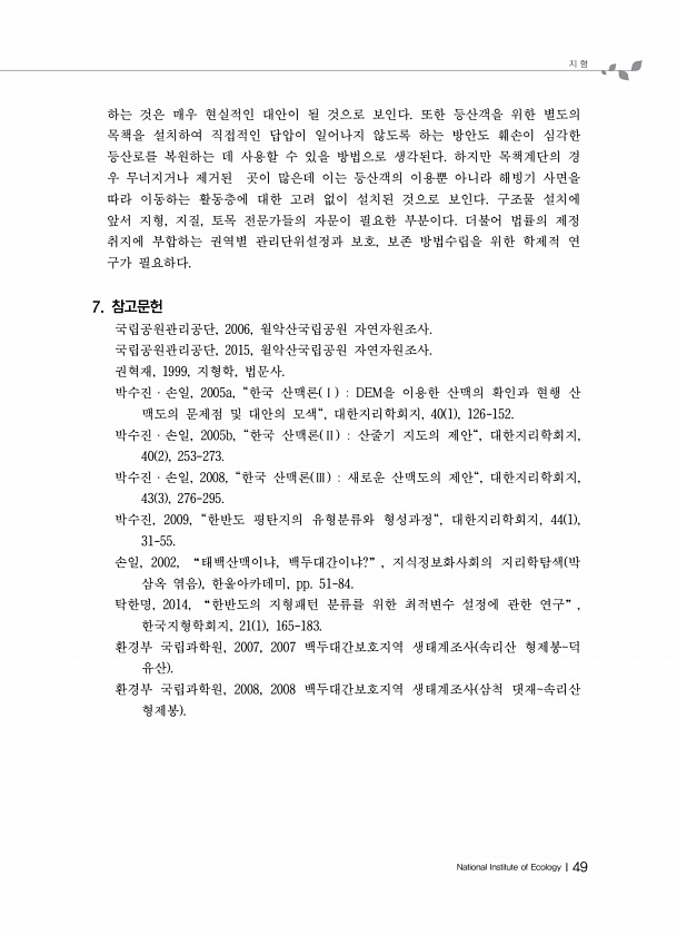 지 형 National Institute of EcologyⅠ49 하는 것은 매우 현실적인 대안이 될 것으로 보인다. 또한 등산객을 위한 별도의 목책을 설치하여 직접적인 답압이 일어나지 않도록 하는 방안도 훼손이 심각한 등산로를 복원하는 데 사용할 수 있을 방법으로 생각된다. 하지만 목책계단의 경 우 무너지거나 제거된 곳이 많은데 이는 등산객의 이용뿐 아니라 해빙기 사면을 따라 이동하는 활동층에 대한 고려 없이 설치된 것으로 보인다. 구조물 설치에 앞서 지형, 지질, 토목 전문가들의 자문이 필요한 부분이다. 더불어 법률의 제정 취지에 부합하는 권역별 관리단위설정과 보호, 보존 방법수립을 위한 학제적 연 구가 필요하다. 7. 참고문헌 국립공원관리공단, 2006, 월악산국립공원 자연자원조사. 국립공원관리공단, ...