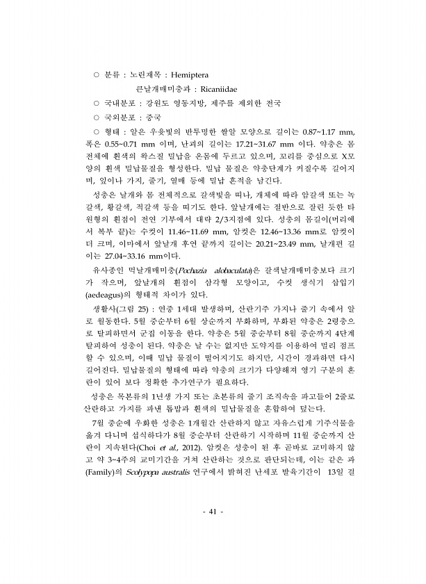 41 ○ 분류 노린재목 Hemiptera 큰날개매미충과 Ricaniidae ○ 국내분포 강원도 영동지방, 제주를 제외한 전국 ○ 국외분포 중국 ○ 형태 알은 우윳빛의 반투명한 쌀알 모양으로 길이는 0.871.17 mm, 폭은 0.550.71 mm 이며, 난괴의 길이는 17.2131.67 mm 이다. 약충은 몸 전체에 흰색의 왁스질 밀납을 온몸에 두르고 있으며, 꼬리를 중심으로 X모 양의 흰색 밀납물질을 형성한다. 밀납 물질은 약충단계가 커질수록 길어지 며, 잎이나 가지, 줄기, 열매 등에 밀납 흔적을 남긴다. 성충은 날개와 몸 전체적으로 갈색빛을 띠나, 개체에 따라 암갈색 또는 녹 갈색, 황갈색, 적갈색 등을 띠기도 한다. 앞날개에는 절반으로 잘린 듯한 타 원형의 흰점이 전연 기부에서 대략 2/3지점에 있다...