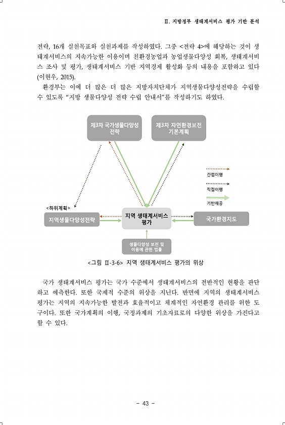 Ⅱ. 지방정부 생태계서비스 평가 기반 분석 43 전략, 16개 실천목표와 실천과제를 작성하였다. 그중 전략 4 에 해당하는 것이 생 태계서비스의 지속가능한 이용이며 친환경농업과 농업생물다양성 회복, 생태계서비 스 조사 및 평가, 생태계서비스 기반 지역경제 활성화 등의 내용을 포함하고 있다 이현우, 2015 환경부는 이에 더 많은 더 많은 지방자치단체가 지역생물다양성전략을 수립할 수 있도록 “지방 생물다양성 전략 수립 안내서”를 작성하기도 하였다. 그림 Ⅱ-3-6 지역 생태계서비스 평가의 위상 국가 생태계서비스 평가는 국가 수준에서 생태계서비스의 전반적인 현황을 판단 하고 예측한다. 또한 국제적 수준의 위상을 지닌다. 반면에 지역의 생태계서비스 평가는 지역의 지속가능한 발전과 효율적이고 체계적인 자연환경 관리...