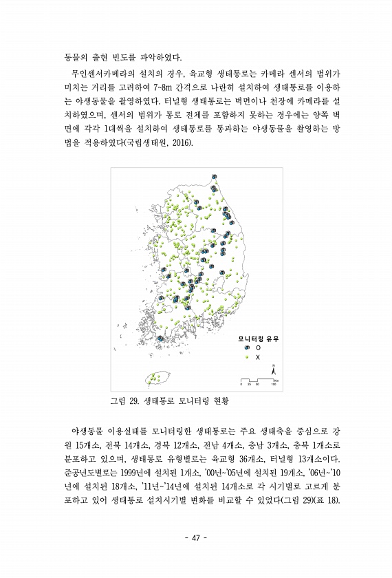 47 동물의 출현 빈도를 파악하였다. 무인센서카메라의 설치의 경우, 육교형 생태통로는 카메라 센서의 범위가 미치는 거리를 고려하여 78m 간격으로 나란히 설치하여 생태통로를 이용하 는 야생동물을 촬영하였다. 터널형 생태통로는 벽면이나 천장에 카메라를 설 치하였으며, 센서의 범위가 통로 전체를 포함하지 못하는 경우에는 양쪽 벽 면에 각각 1대씩을 설치하여 생태통로를 통과하는 야생동물을 촬영하는 방 법을 적용하였다 국립생태원, 2016 그림 29. 생태통로 모니터링 현황 야생동물 이용실태를 모니터링한 생태통로는 주요 생태축을 중심으로 강 원 15개소, 전북 14개소, 경북 12개소, 전남 4개소, 충남 3개소, 충북 1개소로 분포하고 있으며, 생태통로 유형별로는 육교형 36개소, 터널형 13개소이다. 준공년도별...