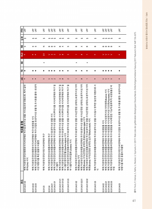 부록 1. 독일 절멸위험 비오톱 유형의 적색목록 출처Finck, P., Heinze, S., Raths, U., Riecken, U. Ssymank, A. 2017 Rote Liste der gef?hrdeten Biotoptypen Deutschlands. Dritte fortgeschriebene Fassung 2017.-Natursch. Biol. Vielf. 156, 637S. 코드 비오톱 유형 nG TE SE RLD RE § 30 FFH 02.01.02.01.03 북해 저생대/진연안/패류화석지/바덴해와 하구/표생저서성 생물 서식/일년생 대형조류, 특히 갈파 래속 Ulva 서식 ? ? ? S § LRT 02.01.02.02 북해 저생대/진연안/패류화석지/바덴해와 하구/내생동물 서식 ? ? ? S § ...
