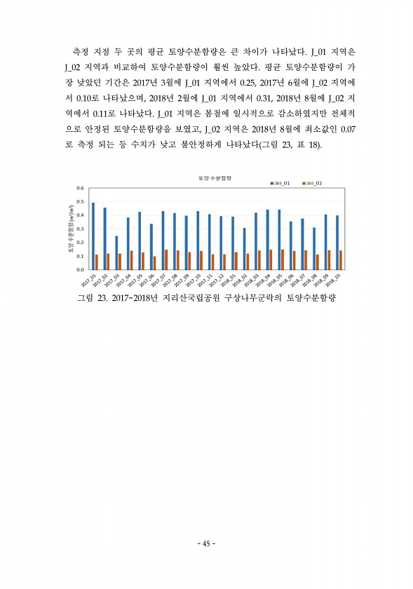 45 측정 지점 두 곳의 평균 토양수분함량은 큰 차이가 나타났다. J_01 지역은 J_02 지역과 비교하여 토양수분함량이 훨씬 높았다. 평균 토양수분함량이 가 장 낮았던 기간은 2017년 3월에 J_01 지역에서 0.25, 2017년 6월에 J_02 지역에 서 0.10로 나타났으며, 2018년 2월에 J_01 지역에서 0.31, 2018년 8월에 J_02 지 역에서 0.11로 나타났다. J_01 지역은 봄철에 일시적으로 감소하였지만 전체적 으로 안정된 토양수분함량을 보였고, J_02 지역은 2018년 8월에 최소값인 0.07 로 측정 되는 등 수치가 낮고 불안정하게 나타났다 그림 23, 표 18 그림 23. 2017O2018년 지리산국립공원 구상나무군락의 토양수분함량 45