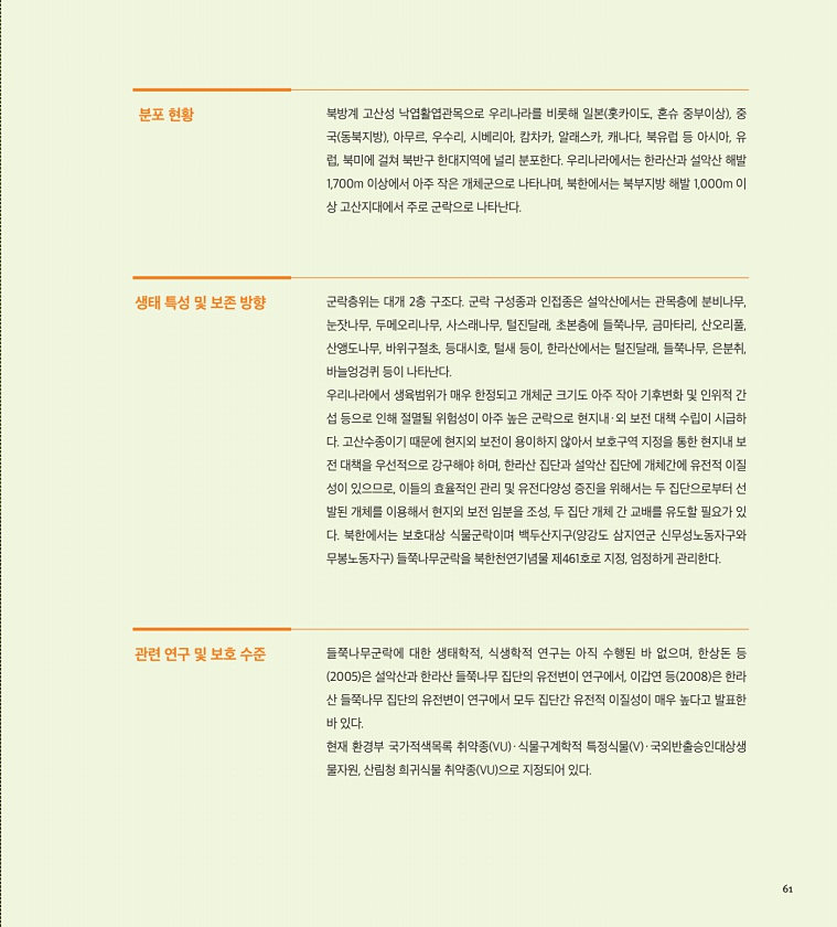 분포 현황 북방계 고산성 낙엽활엽관목으로 우리나라를 비롯해 일본 홋카이도, 혼슈 중부이상 , 중 국 동북지방 , 아무르, 우수리, 시베리아, 캄차카, 알래스카, 캐나다, 북유럽 등 아시아, 유 럽, 북미에 걸쳐 북반구 한대지역에 널리 분포한다. 우리나라에서는 한라산과 설악산 해발 1,700m 이상에서 아주 작은 개체군으로 나타나며, 북한에서는 북부지방 해발 1,000m 이 상 고산지대에서 주로 군락으로 나타난다. 생태 특성 및 보존 방향 군락층위는 대개 2층 구조다. 군락 구성종과 인접종은 설악산에서는 관목층에 분비나무, 눈잣나무, 두메오리나무, 사스래나무, 털진달래, 초본층에 들쭉나무, 금마타리, 산오리풀, 산앵도나무, 바위구절초, 등대시호, 털새 등이, 한라산에서는 털진달래, 들쭉나무, 은분취, 바늘엉겅...
