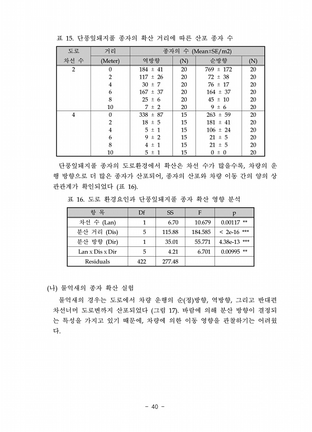 Mean±SE/m2 Meter N N 2 0 184 ± 41 20 769 ± 172 20 2 117 ± 26 20 72 ± 38 20 4 30 ± 7 20 76 ± 17 20 6 167 ± 37 20 164 ± 37 20 8 25 ± 6 20 45 ± 10 20 10 7 ± 2 20 9 ± 6 20 4 0 338 ± 87 15 263 ± 59 20 2 18 ± 5 15 181 ± 41 20 4 5 ± 1 15 106 ± 24 20 6 9 ± 2 15 21 ± 5 20 8 4 ± 1 15 21 ± 5 20 10 5 ± 1 15 0 ± 0 20 15. , , 16 Df SS F p Lan 1 6.70 10.679 0.00117 ** Dis 5 115.88 184.585 2e-16 *** Dir 1 35.01 5...