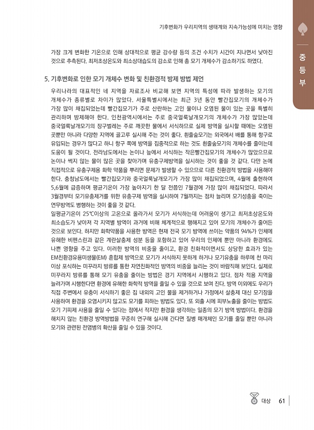 대상 61 중 등 부 기후변화가 우리지역의 생태계와 지속가능성에 미치는 영향 가장 크게 변화한 기온으로 인해 상대적으로 평균 강수량 등의 조건 수치가 시간이 지나면서 낮아진 것으로 추측된다. 최저초상온도와 최소상대습도의 감소로 인해 총 모기 개체수가 감소하기도 하였다. 5. 기후변화로 인한 모기 개체수 변화 및 친환경적 방제 방법 제언 우리나라의 대표적인 네 지역을 자료조사 비교해 보면 지역의 특성에 따라 발생하는 모기의 개체수가 종류별로 차이가 많았다. 서울특별시에서는 최근 3년 동안 빨간집모기의 개체수가 가장 많이 채집되었는데 빨간집모기가 주로 산란하는 고인 물이나 오염된 물이 있는 곳을 특별히 관리하며 방제해야 한다. 인천광역시에서는 주로 중국얼룩날개모기의 개체수가 가장 많았는데 중국얼룩날개모기의 장구...