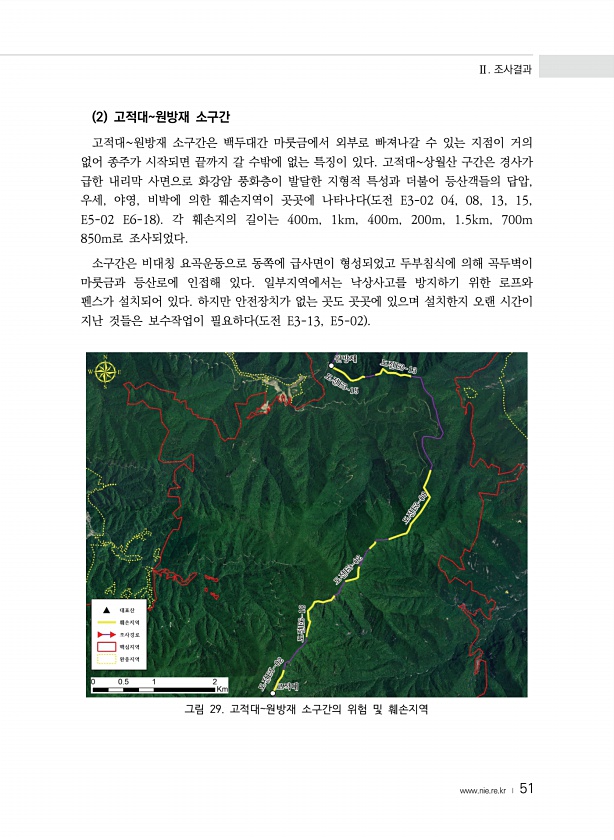 Ⅱ. 조사결과 www.nie.re.kr ? 51 2 고적대원방재 소구간 고적대원방재 소구간은 백두대간 마룻금에서 외부로 빠져나갈 수 있는 지점이 거의 없어 종주가 시작되면 끝까지 갈 수밖에 없는 특징이 있다. 고적대상월산 구간은 경사가 급한 내리막 사면으로 화강암 풍화층이 발달한 지형적 특성과 더불어 등산객들의 답압, 우세, 야영, 비박에 의한 훼손지역이 곳곳에 나타나다 도전 E3-02 04, 08, 13, 15, E5-02 E6-18 각 훼손지의 길이는 400m, 1km, 400m, 200m, 1.5km, 700m 850m로 조사되었다. 소구간은 비대칭 요곡운동으로 동쪽에 급사면이 형성되었고 두부침식에 의해 곡두벽이 마룻금과 등산로에 인접해 있다. 일부지역에서는 낙상사고를 방지하기 위한 로프와 펜스가 설치...