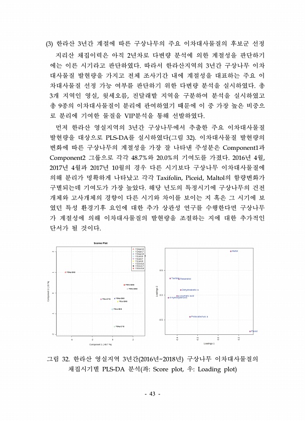 43 3 한라산 3년간 계절에 따른 구상나무의 주요 이차대사물질의 후보군 선정 지리산 채집이력은 아직 2년차로 다변량 분석에 의한 계절성을 판단하기 에는 이른 시기라고 판단하였다. 따라서 한라산지역의 3년간 구상나무 이차 대사물질 발현량을 가지고 전체 조사기간 내에 계절성을 대표하는 주요 이 차대사물질 선정 가능 여부를 판단하기 위한 다변량 분석을 실시하였다. 총 3개 지역인 영실, 윗세오름, 진달래밭 지역을 구분하여 분석을 실시하였고 총 9종의 이차대사물질이 분리에 관여하였기 때문에 이 중 가장 높은 비중으 로 분리에 기여한 물질을 VIP분석을 통해 선발하였다. 먼저 한라산 영실지역의 3년간 구상나무에서 추출한 주요 이차대사물질 발현량을 대상으로 PLS-DA를 실시하였다 그림 32 이차대사물질 발현량의 변...