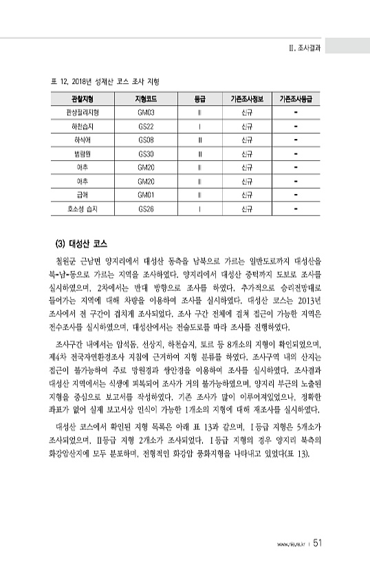 Ⅱ. 조사결과 www.nie.re.kr ? 51 관찰지형 지형코드 등급 기존조사정보 기존조사등급 판상절리지형 GM03 Ⅱ 신규 하천습지 GS22 Ⅰ 신규 하식애 GS08 Ⅲ 신규 범람원 GS30 Ⅲ 신규 애추 GM20 Ⅱ 신규 애추 GM20 Ⅱ 신규 급애 GM01 Ⅱ 신규 호소성 습지 GS26 Ⅰ 신규 표 12. 2018년 성재산 코스 조사 지형 3 대성산 코스 철원군 근남면 양지리에서 대성산 동측을 남북으로 가르는 일반도로까지 대성산을 북-남-동으로 가르는 지역을 조사하였다. 양지리에서 대성산 중턱까지 도보로 조사를 실시하였으며, 2차에서는 반대 방향으로 조사를 하였다. 추가적으로 승리전망대로 들어가는 지역에 대해 차량을 이용하여 조사를 실시하였다. 대성산 코스는 2013년 조사에서 전 구간이 겹치게 조사...