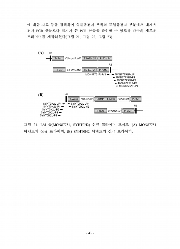 43 에 대한 자료 등을 검색하여 식물유전자 부위와 도입유전자 부분에서 내재유 전자 PCR 산물보다 크기가 큰 PCR 산물을 확인할 수 있도록 다수의 새로운 프라이머를 제작하였다 그림 21, 그림 22, 그림 23 그림 21. LM 콩 MON87751, SYHT0H2 신규 프라이머 모식도. A MON87751 이벤트의 신규 프라이머, B SYHT0H2 이벤트의 신규프라이머.