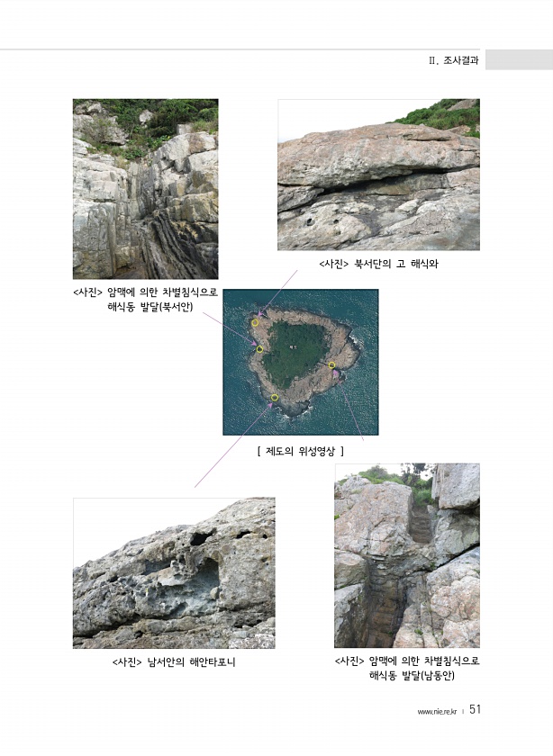 Ⅱ. 조사결과 www.nie.re.kr ? 51 [ 제도의 위성영상 ] 사진 암맥에 의한 차별침식으로 해식동 발달 남동안 사진 남서안의 해안타포니 사진 북서단의 고 해식와 사진 암맥에 의한 차별침식으로 해식동 발달 북서안
