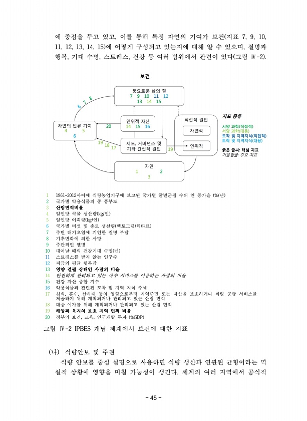 45 1 1961-2012사이에 식량농업기구에 보고된 국가별 꿀벌군집 수의 연 증가율 %/년 2 국가별 약용식물의 종 풍부도 3 산림면적비율 4 일인당 곡물 생산량 kg/인 5 일인당 어획량 kg/인 6 국가별 버섯 및 송로 생산량 헥토그램/헥타르 7 주변 대기오염에 기인한 질병 부담 8 기후변화에 의한 사망 9 주관적인 웰빙 10 태어날 때의 건강기대 수명 년 11 스트레스를 받지 않는 인구수 12 지금의 평균 행복감 13 영양 결핍 상태인 사람의 비율 14 안전하게 관리되고 있는 식수 서비스를 이용하는 사람의 비율 15 건강 자산 종합 지수 16 약용식물과 관련된 토착 및 지역 지식 추세 17 침식, 홍수, 산사태 등의 영향으로부터 지역주민 또는 자산을 보호하거나 식량 공급 서비스를 제공하기 위해 계획되...