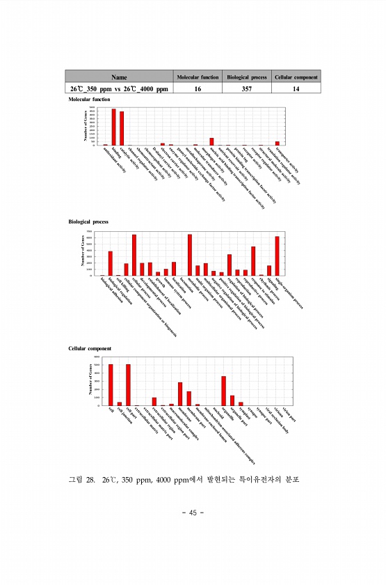 45 Name Molecular function Biological process Cellular component 26℃_350 ppm vs 26℃_4000 ppm 16 357 14 Molecular function Biological process Cellular component 그림 28. 26℃, 350 ppm, 4000 ppm에서 발현되는 특이유전자의분포