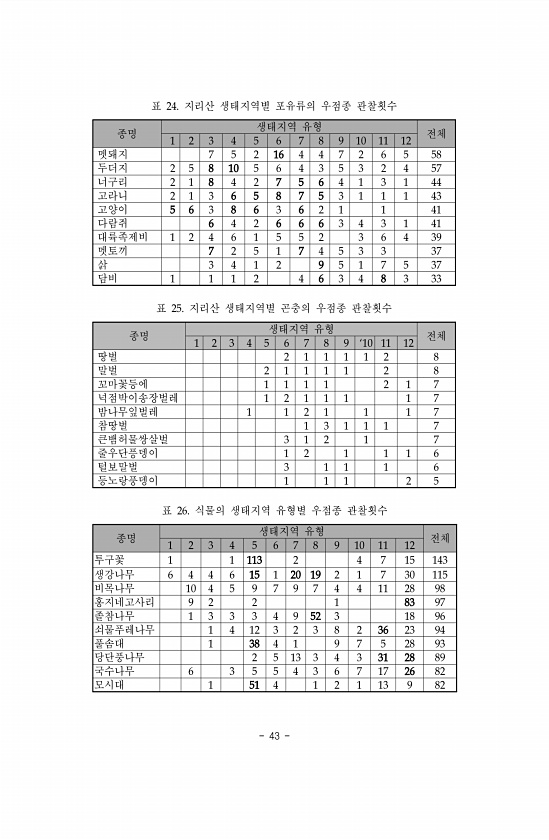 43 종명 생태지역 유형 전체 1 2 3 4 5 6 7 8 9 10 11 12 멧돼지 7 5 2 16 4 4 7 2 6 5 58 두더지 2 5 8 10 5 6 4 3 5 3 2 4 57 너구리 2 1 8 4 2 7 5 6 4 1 3 1 44 고라니 2 1 3 6 5 8 7 5 3 1 1 1 43 고양이 5 6 3 8 6 3 6 2 1 1 41 다람쥐 6 4 2 6 6 6 3 4 3 1 41 대륙족제비 1 2 4 6 1 5 5 2 3 6 4 39 멧토끼 7 2 5 1 7 4 5 3 3 37 삵 3 4 1 2 9 5 1 7 5 37 담비 1 1 1 2 4 6 3 4 8 3 33 표 24. 지리산 생태지역별 포유류의 우점종 관찰횟수 종명 생태지역 유형 전체 1 2 3 4 5 6 7 8 9 `10 11 12 땅벌 ...