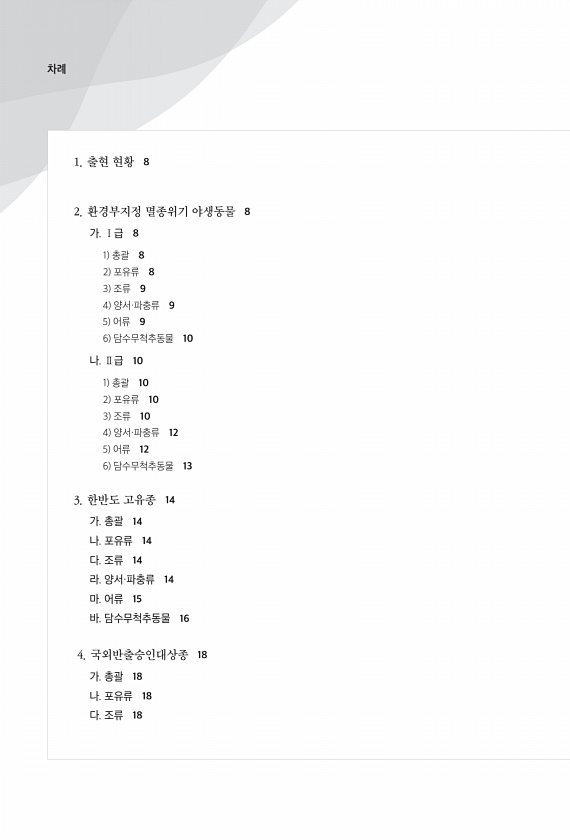차례 1. 출현 현황 8 2. 환경부지정 멸종위기 야생동물 8 가. Ⅰ급 8 1 총괄 8 2 포유류 8 3 조류 9 4 양서·파충류 9 5 어류 9 6 담수무척추동물 10 나. Ⅱ급 10 1 총괄 10 2 포유류 10 3 조류 10 4 양서·파충류 12 5 어류 12 6 담수무척추동물 13 3. 한반도 고유종 14 가. 총괄 14 나. 포유류 14 다. 조류 14 라. 양서·파충류 14 마. 어류 15 바. 담수무척추동물 16 4. 국외반출승인대상종 18 가. 총괄 18 나. 포유류 18 다. 조류18
