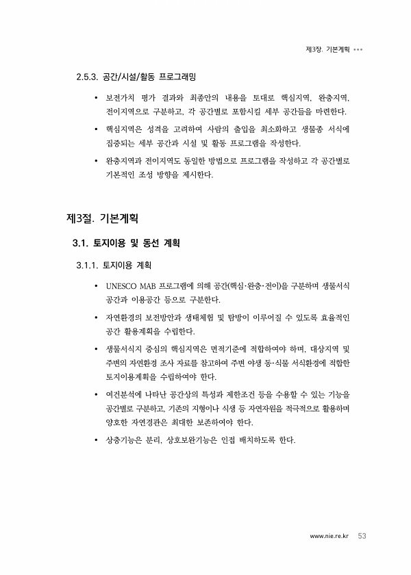 www.nie.re.kr 53 제3장. 기본계획 2.5.3. 공간/시설/활동 프로그래밍 보전가치 평가 결과와 최종안의 내용을 토대로 핵심지역, 완충지역, 전이지역으로 구분하고, 각 공간별로 포함시킬 세부 공간들을 마련한다. 핵심지역은 성격을 고려하여 사람의 출입을 최소화하고 생물종 서식에 집중되는 세부 공간과 시설 및 활동 프로그램을 작성한다. 완충지역과 전이지역도 동일한 방법으로 프로그램을 작성하고 각 공간별로 기본적인 조성 방향을 제시한다. 제3절. 기본계획 3.1. 토지이용 및 동선 계획 3.1.1. 토지이용 계획 UNESCO MAB 프로그램에 의해 공간 핵심?완충?전이 을 구분하며 생물서식 공간과 이용공간 등으로 구분한다. 자연환경의 보전방안과 생태체험 및 탐방이 이루어질 수 있도록 효율적인 공간 활...