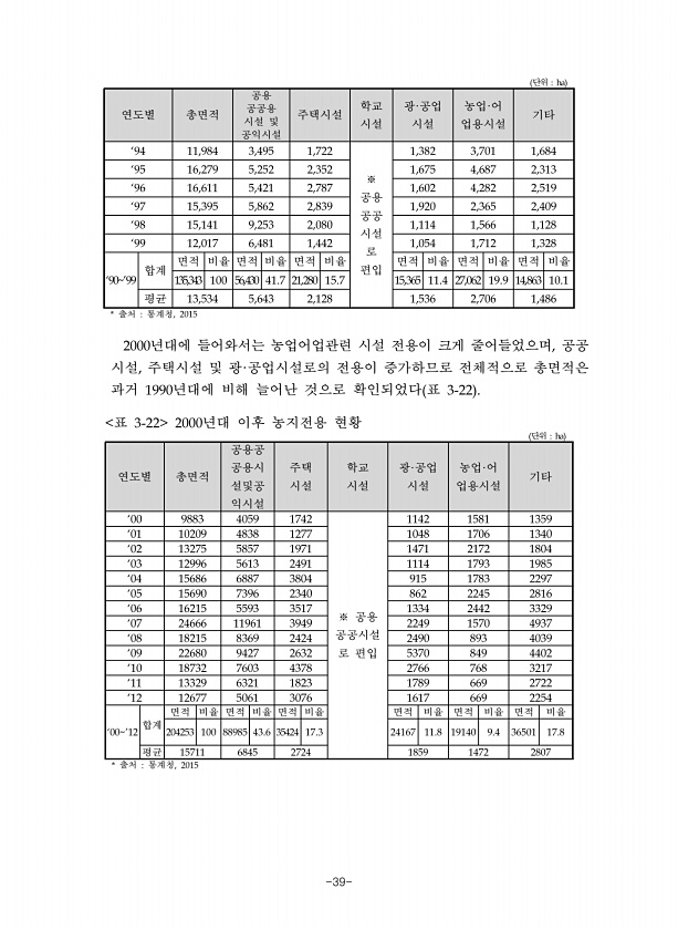 -39- 단위 연도별 총면적 공용 공공용 시설 및 공익시설 주택시설 학교 시설 광 공업 시설 농업 어 업용시설 기타 공용 공공 시설 로 합계 면적 비율 면적 비율 면적 비율 편입 면적 비율 면적 비율 면적 비율 평균 출처 통계청 년대에 들어와서는 농업어업관련 시설 전용이 크게 줄어들었으며 공공 시설 주택시설 및 광 공업시설로의 전용이 증가하므로 전체적으로 총면적은 과거 년대에 비해 늘어난 것으로 확인되었다 표 단위 연도별 총면적 공용공 공용시 설및공 익시설 주택 시설 학교 시설 광 공업 시설 농업 어 업용시설 기타 공용 공공시설 로 편입 합계 면적 비율 면적 비율 면적 비율 면적 비율 면적 비율 면적 비율 평균 출처 통계청 표 년대 이후 농지전용현황